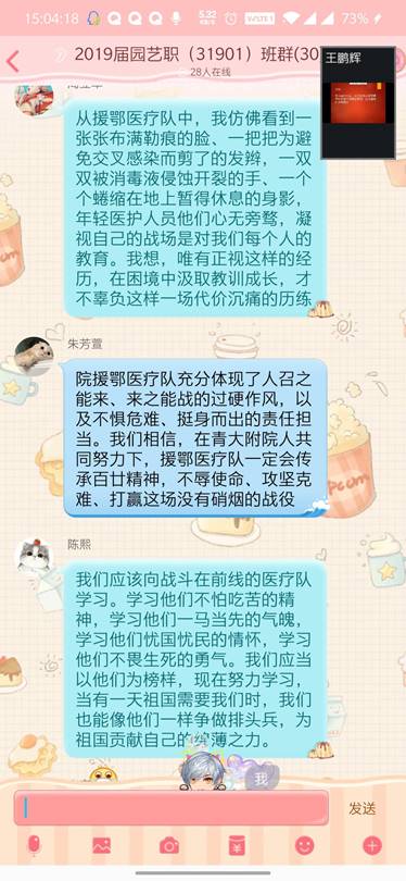 学院师生十分重视此次学习活动,各团支部积极响应学校号召,虽然班级特色各不相同,学习领悟侧重点不同,但都把活动主题精神贯彻始终。各团支部利用网络直播视频会议、微信群、QQ群大讨论等多种形式积极开展,热情高涨。各团支部以“青春战‘疫’,一展芳华”为主题召开线上班主题班团会,学习内容包括深入贯彻《习近平总书记回信勉励北京大学援鄂医疗队全体“90后”党员》重要精神,围绕信件进行一次大讨论等。各团支部通过PPT展示、分享视频、讲颂事迹、自由讨论等多种形式纷纷热议,班主任也全程参与,与学生进行互动交流,坚持做好疫情期间通过思想引领提升认知视野,进而帮助心理疏导。