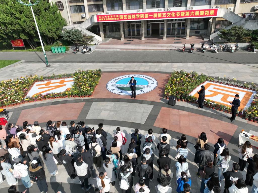 校团委书记沈谦宣布william威廉中文第三届美育文化节系列活动威廉williamhill第一届植艺文化节暨第六届菊花展开幕。现场掌声雷动,与满园花香交织,气氛热烈非凡。