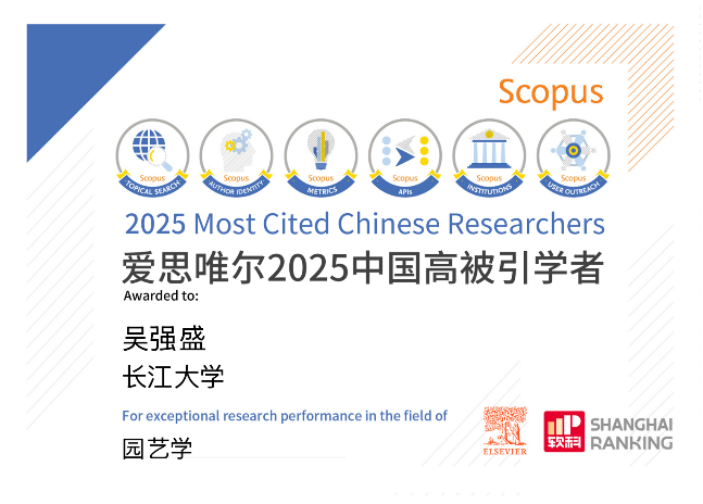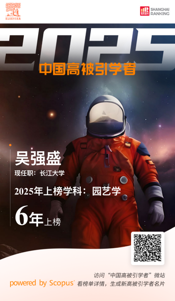(通讯员 王晓娥)1月30日,全球知名信息分析机构爱思唯尔(Elsevier)正式发布2025年度“中国高被引学者”(Highly Cited Chinese Researchers)榜单。该榜单基于全球权威的引文与索引数据库Scopus,采用上海软科教育信息咨询有限公司开发的方法,对中国学者的科研成果进行统计。本次共有6310位学者入选,其中园艺学领域共有20人。我院园艺学科吴强盛教授再度上榜,这是其连续第6年入选该榜单。根据Scopus数据,吴强盛教授目前已发表论文328篇,累计被引10381次,个人h-index为54。