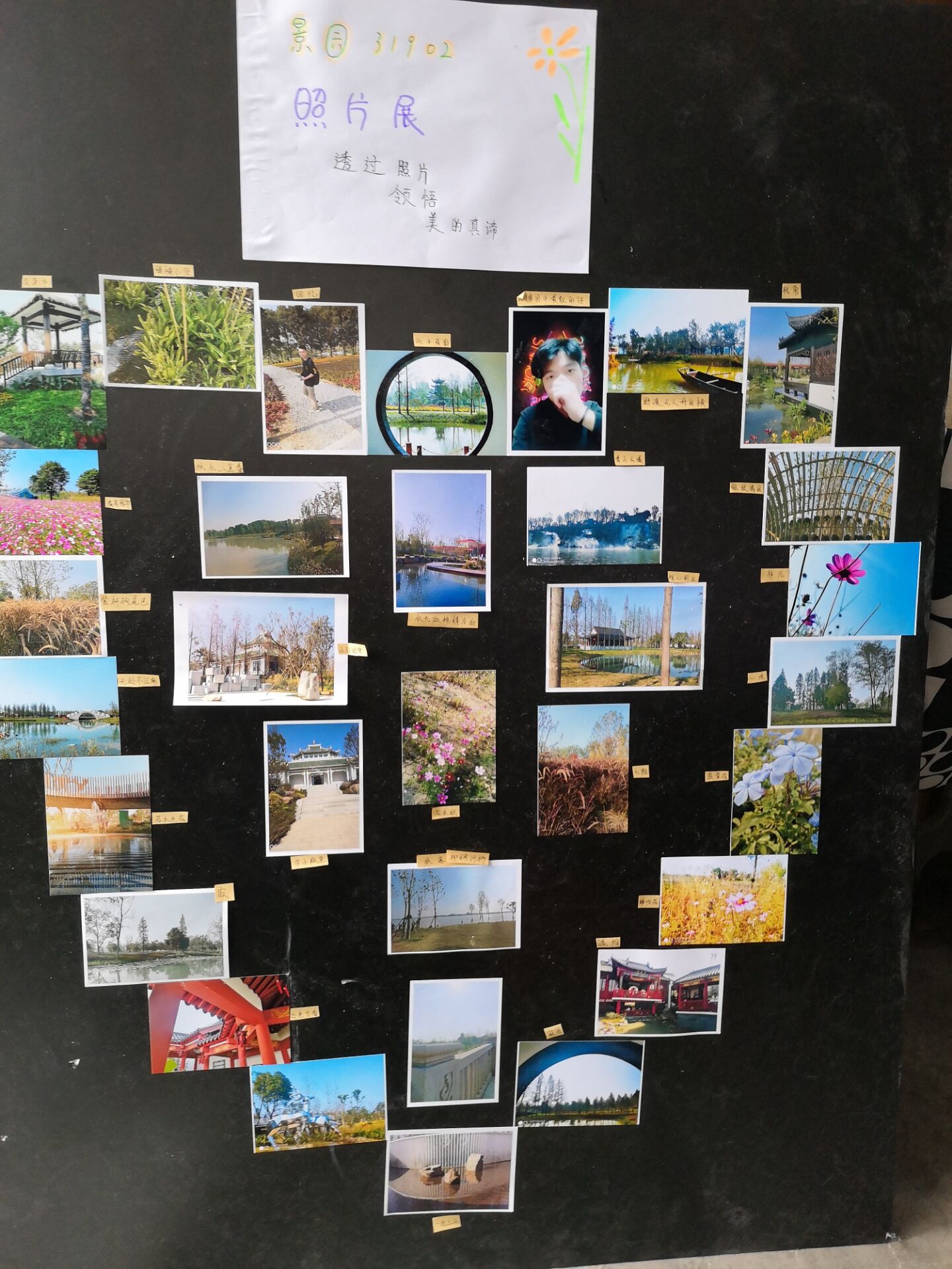 耳闻之不如目见之,目见之不如足践之。在活动中,照片展主办小组提前到达主办地点将照片统一粘贴到照片墙上。当天天气极佳,场地因此定在农科楼前阳光充足的空地,给照片最好的观赏角度。主办小组所有成员携着对美尚处于朦胧态的同学们的最美“景色”,开始涂胶、贴照片、剪纸条、标号码、装饰照片墙,为活动的顺利进行分工明确,各尽其责。