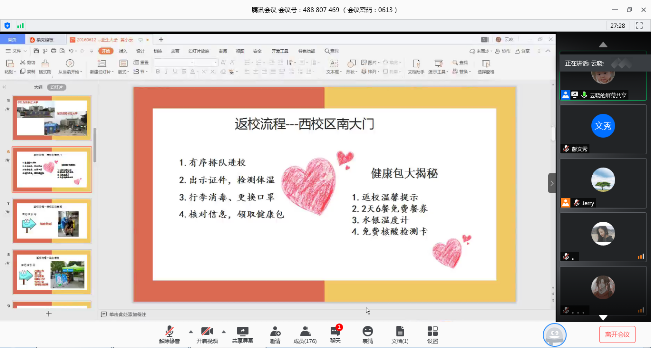 随后,黄小云从返校流程、毕业手续和就业工作三个方面进行了讲解。首先,毕业生入校时应做到有序排队进校,出示证件,检测体温,行李消毒、更换口罩,核对信息,领取健康包;其次,根据毕业流程做好上交安全告知书、毕业生登记表、体检表、图书、三方协议、考研学生录取通知书、调档函等各项工作;最后,呼吁大家尽快就业,领取报到证和档案寄出!