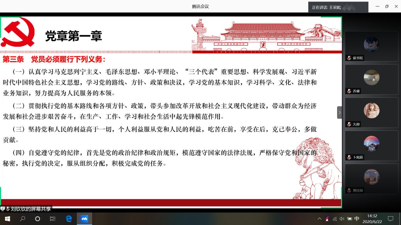 (通讯员:刘钦钦 王采妮)2020年6月22日下午2:30,威廉williamhill本科生党支部通过腾讯会议的方式开展六月主题党日活动,支部书记彭文秀出席了会议,全体党员准时到会,会议由刘钦钦和王采妮同志主持。