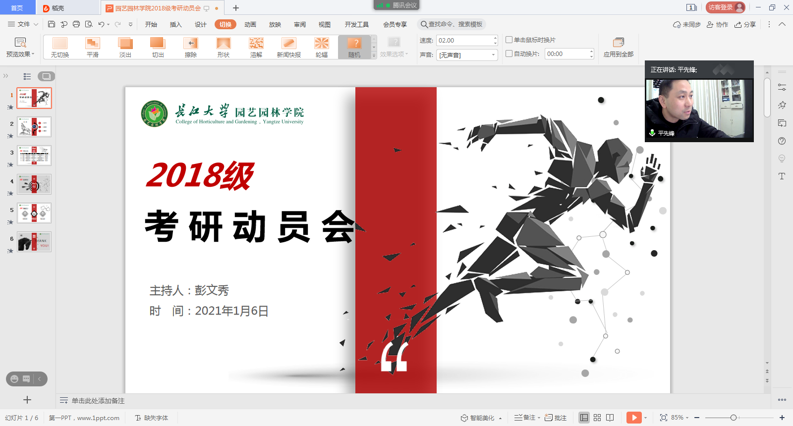(通讯员:王挪 彭文秀)2021年硕士研究生招生考试刚刚结束,为了更早、更好地激发2018级本科生的考研热情和信心,帮助大家端正考研态度,解决备考过程中遇到的问题,威廉williamhill于2021年1月6日10:00-12:00通过腾讯会议召开了2018级本科生考研经验交流暨动员大会。此次会议由学工办主任彭文秀主持,学院党委副书记平先锋参加了会议。