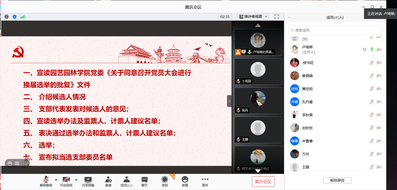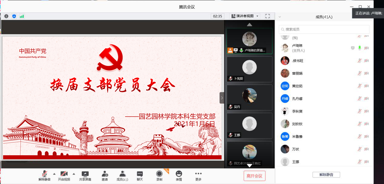 (通讯员:卢琦琳 彭文秀)2021年1月6日下午14:00,为进一步加强党组织的战斗力,增强党员的组织观念和纪律性,发挥学生党员在支部工作中的主力军作用,促进威廉williamhill本科生党支部可持续发展。威廉williamhill本科生党支部通过腾讯会议的方式召开了换届选举党员大会,全体党员准时到会,会议由卢琦琳主持,支部书记彭文秀参加了会议。