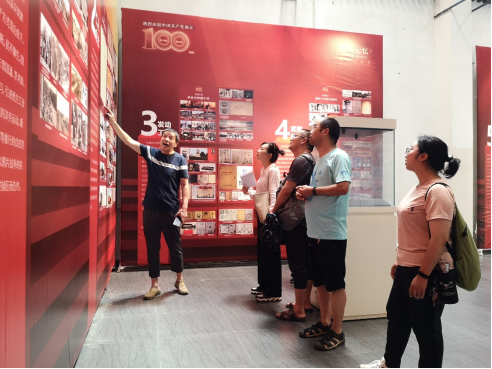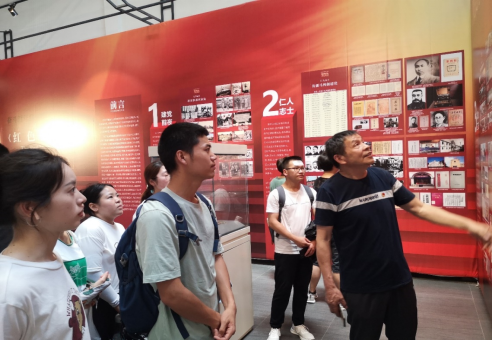 上午,在学院老师的带领下,一行人来到了传承院的红色历史展厅,观看了《红色记忆与实物展》,并由谢荆江馆长亲自为我们讲解。在党的百年历史中,谢馆长对照着墙上的照片和展柜里的实物为我们讲述了中国共产党的诞生,中国共产党在成立前夕做了哪些准备,中共一大又是如何召开的;在看到一把已经泛黄的手枪的图片的时候,谢馆长更是激动地说“那可是朱德在武昌起义中使用的手枪咧,现在就放在国家军事博物馆里!”随后又带领为我们参观和翻阅了桌上一些陈列的书记和图册。通过谢馆长绘声绘色的讲解,中国共产党这一百年的光辉历程仿佛就在眼前,让我们切实体会和感受到了中国共产党不屈的风斗精神和敢于革命的斗争精神。
