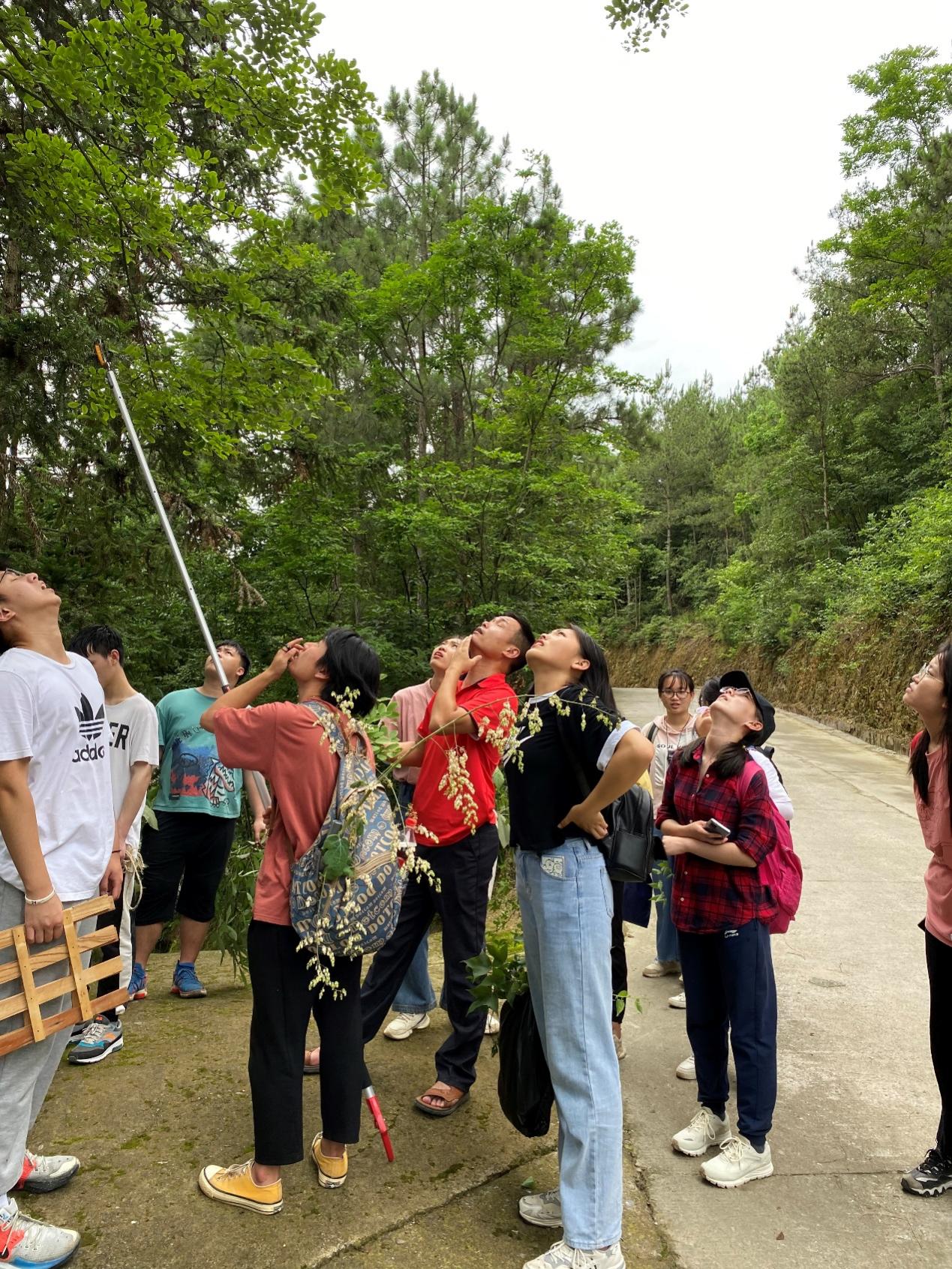 (图为学生在姚振老师指导下用高枝剪采集植物标本)