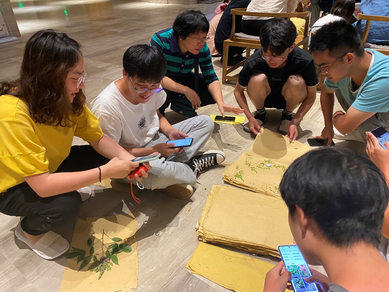 (图为胡蝶老师和黄芬肖老师在酒店席地而坐与学生探讨植物标本的形态特点)
