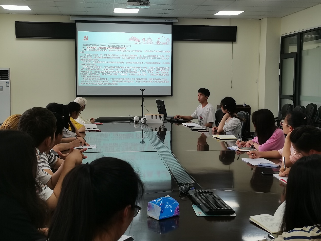 此次会议分为六个部分,分别为:重温入党誓词;学习党章第九章;党史学习教育指定内容(《中国共产党简史》第三章 在抗日战争烽火中壮大);学习党的创新理论(习近平在中国科学院第二十次院士大会、中国工程院第十五次院士大会、中国科协第十次全国代表大会上的讲话(节选),《求是》杂志发表习近平总书记重要文章《学好“四史”,永葆初心、勇担使命》,《中国共产党组织工作条例》,中共中央关于加强对“一把手”和领导班子监督的意见;开展主题研讨-在中国共产党成立一百周年之际,谈如何更好发挥党员干部的先锋模范作用;“书记讲党课”相关内容讨论。