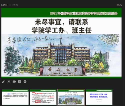 此次班会主要围绕四个方面进行:暑期在校学生管理、暑期在家(在外)学生管理、秋季开学返校安排、其他注意事项。会上由各班班主任和辅导员重点介绍学院对本科生、研究生暑期管理及秋季开学学生返校的相关要求。强调今日校园打卡任务必要性,杜绝每日遗忘打卡、上报虚假信息等,并表示如有此现象将会受到从严从重处分。接着班主任特意指出当前疫情防控形势严峻,疫情防控不容松懈,要求同学们非必要不外出,若必须外出应戴好口罩,勤洗手,注意通风等。同时不忘告诫同学们切勿隐瞒自己真实情况,一旦身体出现任何问题或其他需求,随时向辅导员或班主任寻求帮助。会议最后,班主任对学生暑期学习与作息时间管理方面了解情况并提出建议,并对开学与同学们的相见表示期许。