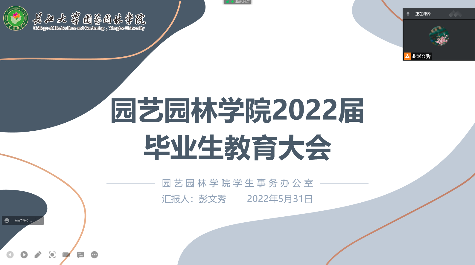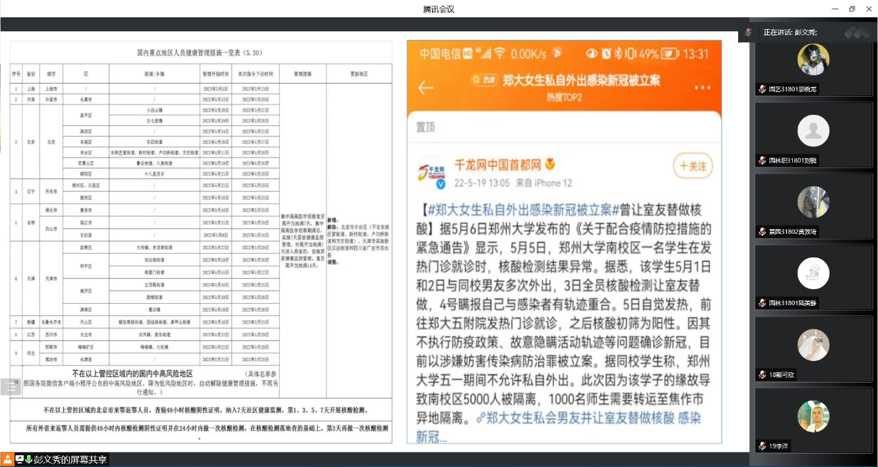 大会伊始,彭老师带领同学们学习近期教育部发布的疫情防控相关文件,进一步宣讲学校防控政策和要求,并通报其他高校学生违反疫情防控政策的严重后果,再次强调“非必要不出校、非批准不离校、非批准不返校”防控要求,并要求大家服从门岗管理,按时、按规定、按要求参加学校核酸检测抽检工作。让毕业生们清楚了解当前防控形势,配合管控要求,进一步做好疫情防护。