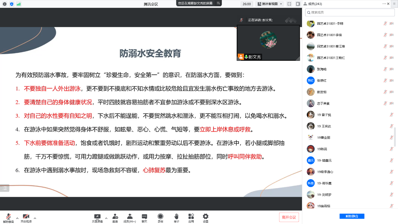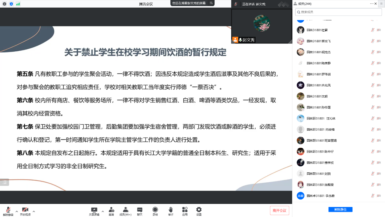 为确保毕业生文明离校、安全毕业、顺利就业,对毕业生进行安全教育、文明离校教育。彭老师向毕业生们展示溺水案例,带领大家学习防溺水安全常识,严禁学生私自外出,杜绝学生近水活动;组织毕业同学学习《william威廉中文关于禁止学生在校学习期间饮酒的暂行规定》,严禁组织任何形式的毕业生聚餐活动;宣讲防诈骗知识和学生被骗案例,引导毕业生提高防范电信诈骗意识。