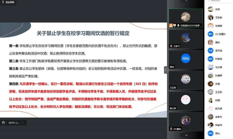 学院要求学生认真办理离校、返校手续,希望每一位同学能够严格履行请假离校、返校申请手续;防溺水教育环节通过溺水案例引入,带领大家学习防溺水安全常识,重点强调严禁私自外出,杜绝近水活动;毕业季来临,班会特别对同学们强调《william威廉中文关于禁止学生在校学习期间饮酒的暂行规定》,严禁组织任何形式的聚餐活动;此外,宣讲防诈骗知识和学生被骗案例,引导同学们提高防范电信诈骗意识。