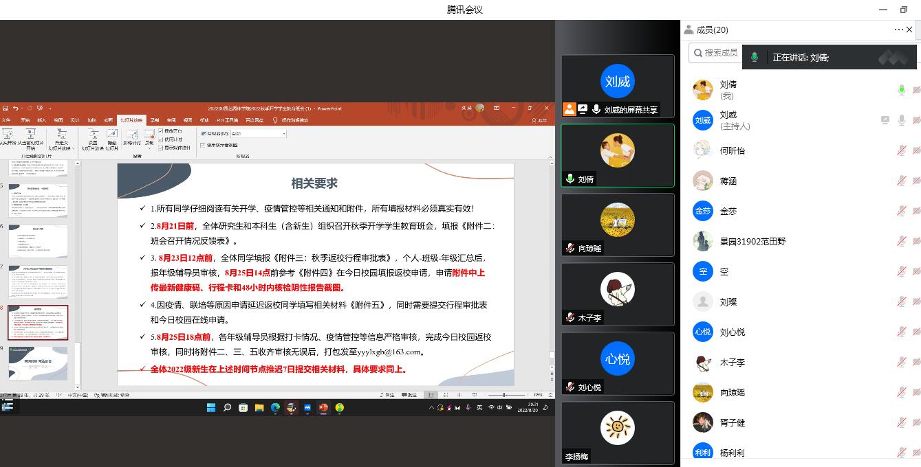 学院首先向学生们说明当前疫情防控安排。一是坚决扛起疫情防控政治责任。要深刻、完整、全面认识疫情防控方针政策,坚决克服认识不足、准备不足、工作不足等问题,坚决筑牢疫情防控屏障,做到守土有责、守土尽责。二是严格落实疫情防控各项措施。要常态化疫情防控措施,配合做好“应检尽检、应隔尽隔、应收尽收、应治尽治”等重点工作。三是科学谋划秋季开学工作安排。要合理分批次报到,严格做好师生返校的前的准备工作,确保异常情况暂缓返校,并要求全体师生积极配合属地政府进行疫情防控,确保师生安全有效返校。