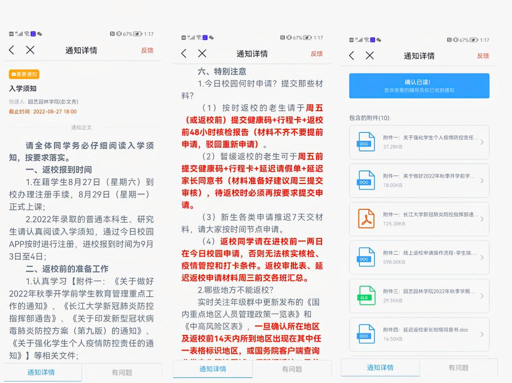 此外,学院学工办将近期学校有关疫情防控和开学返校的通知梳理汇总,通过今日校园向全体学生(含新生)发布开学须知和附件,保证全体同学阅读学习并确认。