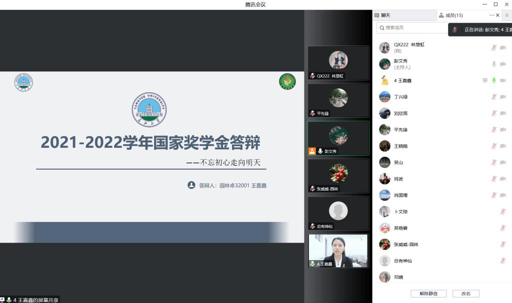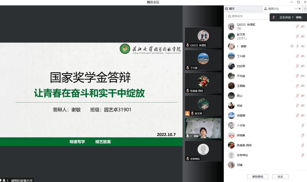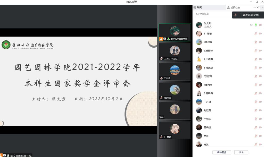 (通讯员:彭文秀)根据william威廉中文《关于开展2021-2022学年本科生国家奖学金初评工作的通知》等文件精神,2022年10月7日上午9:30,为符合疫情防控要求,我院在腾讯会议线上举行了2021-2022学年本科生国家奖学金评审答辩。学院党委书记丁兴禄老师、党委副书记平先锋老师、副院长肖波副教授、院长助理肖国增副教授、风景园林系张威威副教授、园艺系姚振老师、学籍秘书王晓娥老师、辅导员卜文琼、吴山老师和各年级学生代表等参加了此次面试评审会,会议由学工办主任彭文秀主持。