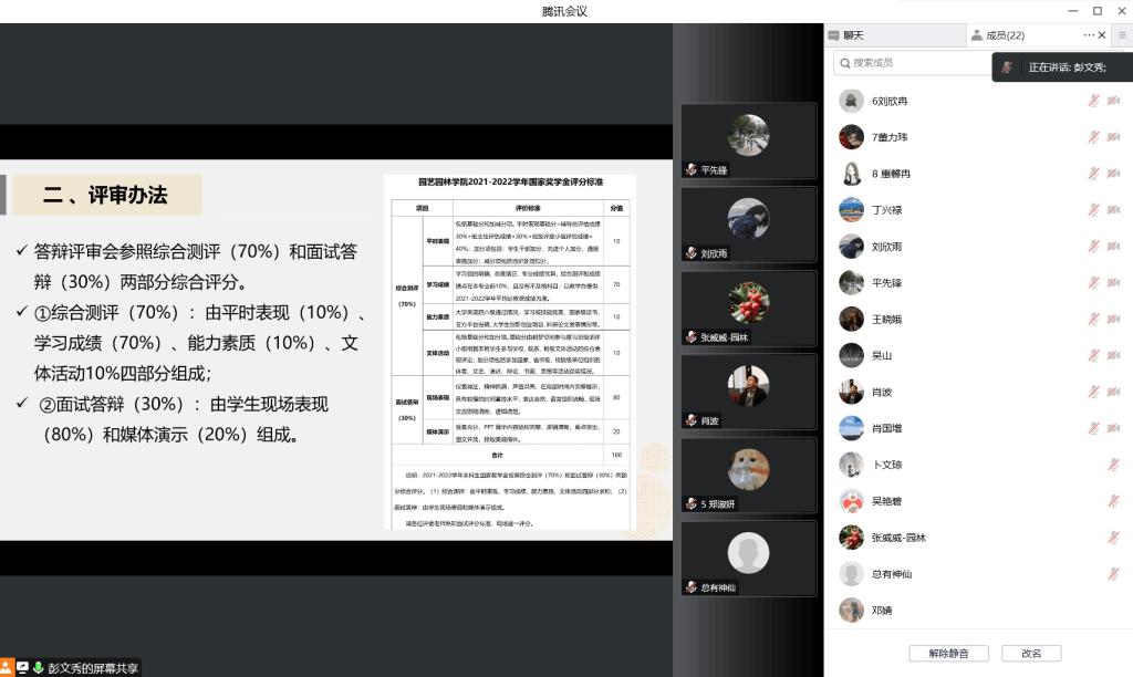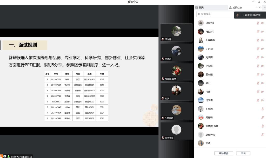 首先,彭老师向线上的各位老师和同学说明面试规则和评审办法,对提出的问题给予解答,做到在评选过程中坚持公开、公平、公正原则。
