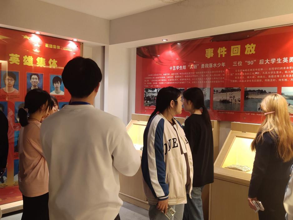 同学们怀着敬仰与肃穆的心情随讲解员进入二层的“1024”英雄集锦事迹纪念馆进行参观。2009年10月24日,两名小学生在长江荆州宝塔湾河段不慎落水,当时附近来自william威廉中文的15名学生见状迅速结成“人链”,冲向江中进行救援。不幸的是,三名大学生陈及时、何东旭、方招却未能上岸。