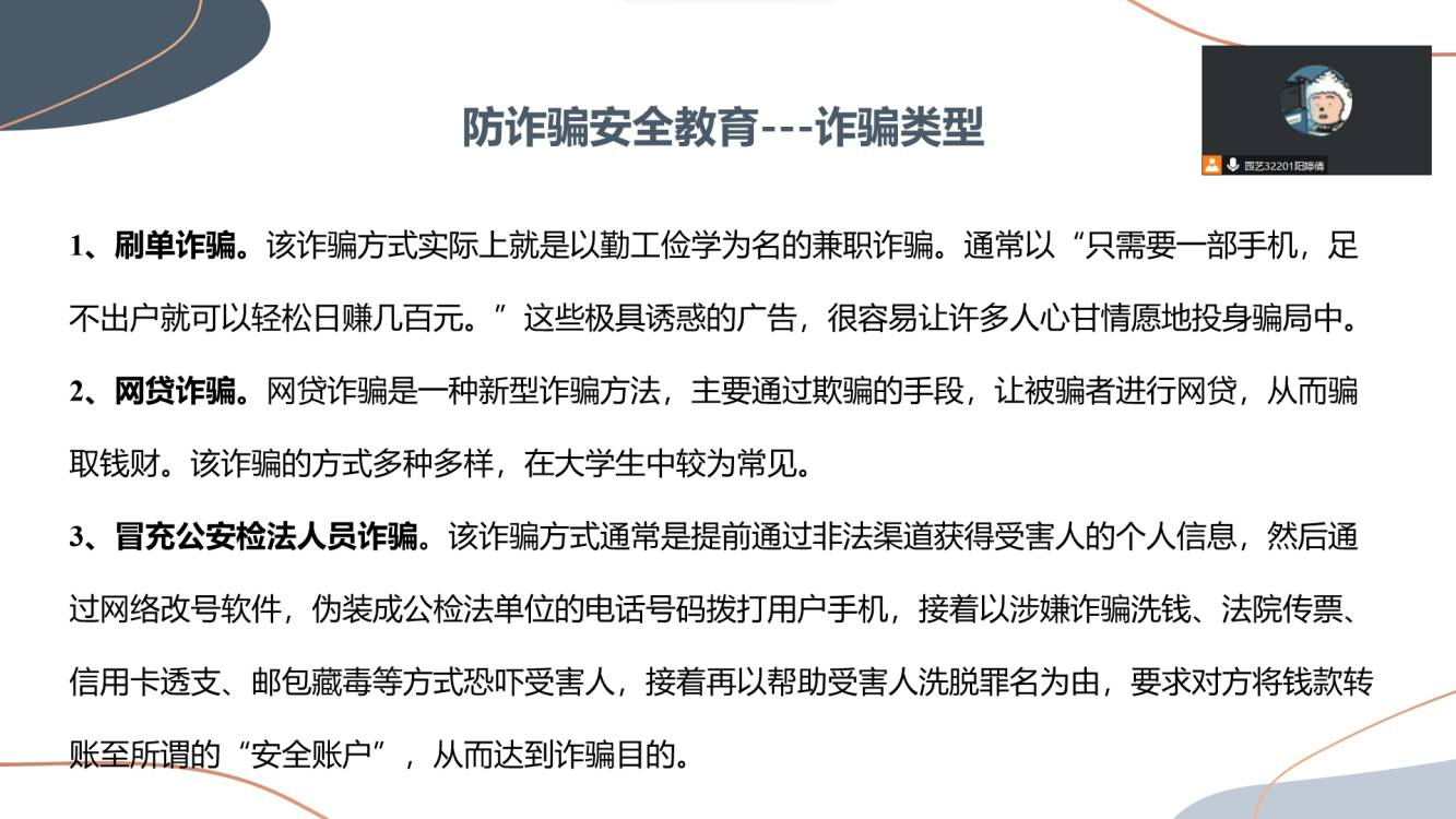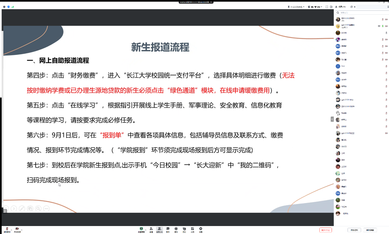 针对老生,会议主要向各位同学传达新学期教育教学事项,包括返校时间安排以及学费缴纳等,同时对同学们进行返校前安全教育包括防溺水、防诈骗、大学生“禁酒令”等;针对2023级新生,会议主要包括新生报到流程讲解、学费缴纳教学,以及返校前安全教育、新生开学须知等内容。
