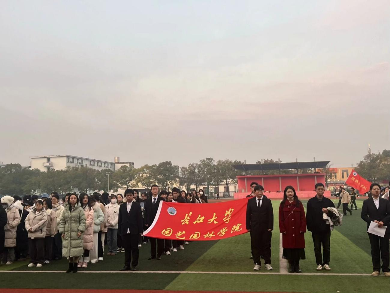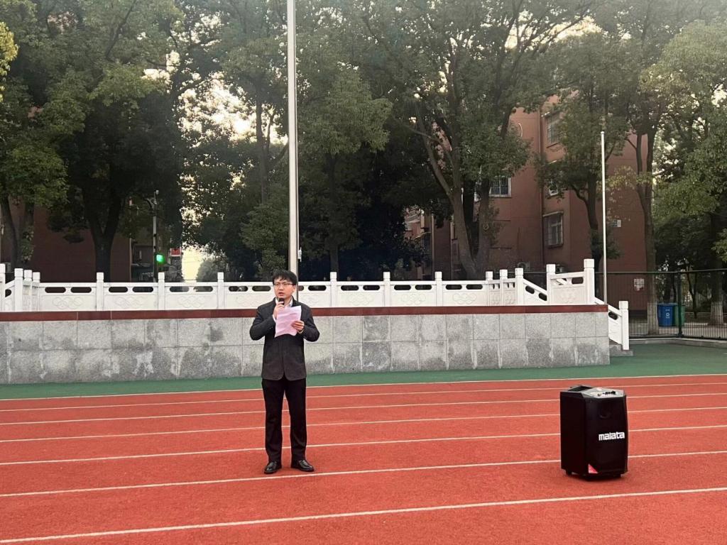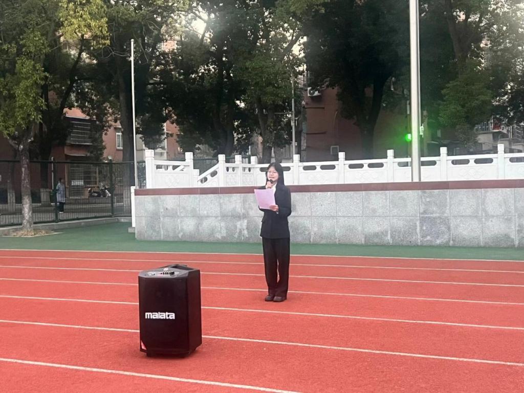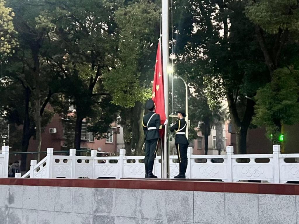 在升旗仪式中,国旗护卫队旗手护送国旗至升旗台,擎旗、撒旗,随着国旗缓缓升起,全体师生齐唱中华人民共和国国歌。接下来,学生代表舒文雪和辅导员张颖旭分别进行国旗下的讲话。