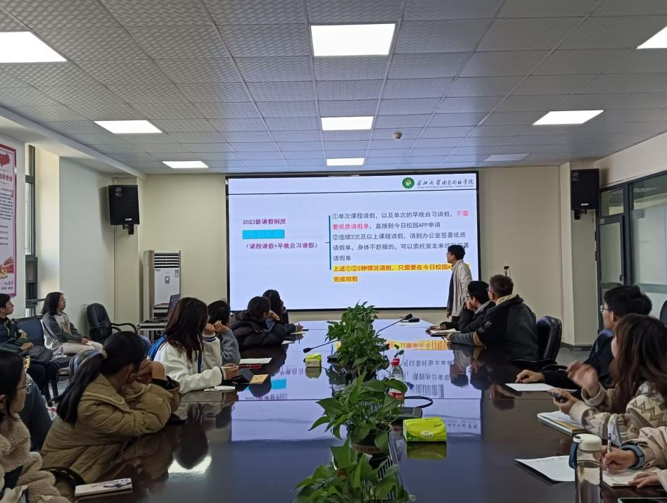 会议伊始,张颖旭详细讲解了新修订的请假制度,对非离校请假和离校请假分别进行说明,明确了请假要求和所需材料,并补充说明了不予准假的几种情况,建议同学们做好时间管理,分清主次,以学业为重,处理好学习与社团活动和学生干部工作等的关系。