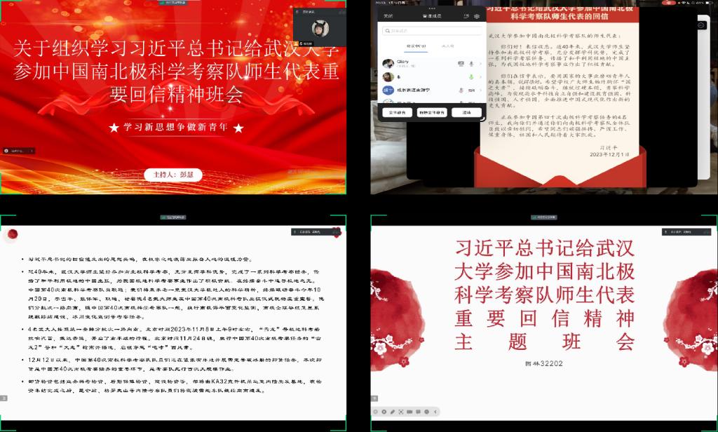 (通讯员 纪玲)2023年12月1日,习近平总书记给武汉大学参加中国南北极科学考察队师生代表回信。习近平总书记在回信中指出:“希望学校广大师生始终胸怀‘国之大者’,接续砥砺奋斗,练就过硬本领,勇攀科学高峰,为实现高水平科技自立自强和建设教育强国、科技强国、人才强国,全面推进中国式现代化作出新的更大贡献。”2024年1月17日至22日,威廉williamhill组织全体本科生与创新理论学习小组成员学习习近平总书记给武汉大学参加中国南北极科学考察队的师生代表回信内容。