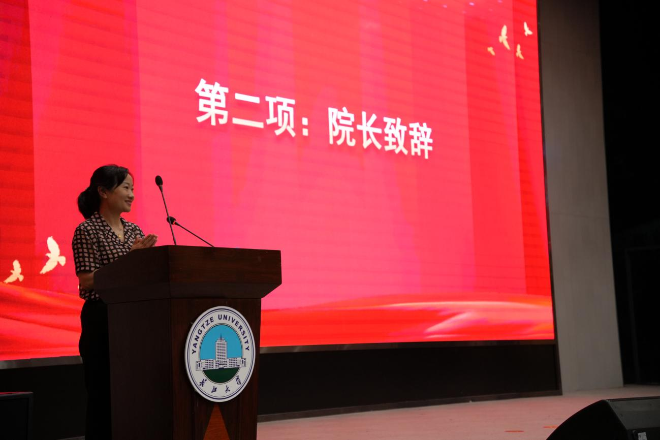 会议伊始,院长周明芹上台致辞,向圆满完成学业的毕业生们表示祝贺,向同学们为学院发展作出的贡献表示感谢。临别之际,她寄语学院全体毕业生:“一是保持敬畏良善的优秀品质;二是保持不断学习的良好学风;三是保持脚踏实地的奋斗品格。愿老师的谆谆教诲陪伴你们乘风破浪,愿学院的殷殷期盼激励你们扬帆远航。愿你们的青春在奋斗中绽放。”周院长的温情赠言直击莘莘学子内心,全场阵阵掌声。