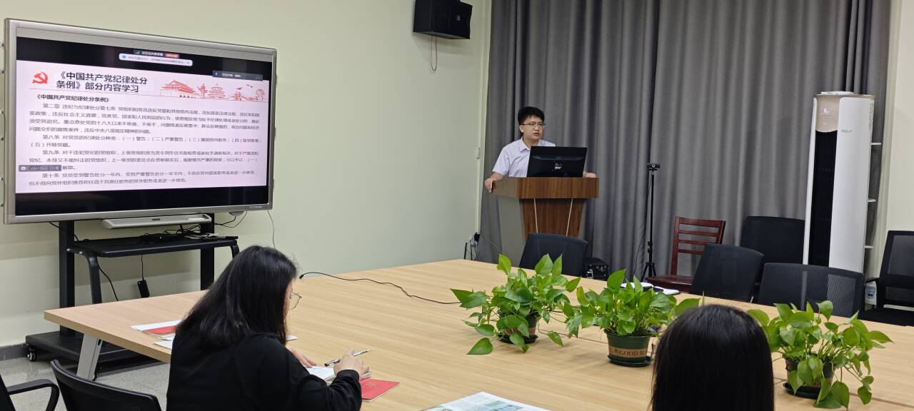 会议伊始,大家重温入党誓词。随后,党支部书记张颖旭讲纪律党课。他强调,党员同志要深入学习《中国共产党纪律处分条例》,贯彻习近平总书记关于党的自我革命重要思想,以党之章程束己之言行。张颖旭指出,开展党纪学习教育十分重要,是深化新时代党的纪律建设、保持新征程党的先进性纯洁性的必然要求,是统一全党思想意志行动、坚决做到“两个维护”的必然要求。他从日常网络生活着手,列举某市公安局副局长吴某在网络媒体上妄议党中央政策方针,严重违反政治纪律,最后受到相应处分的案例,以此警示其他党员同志。