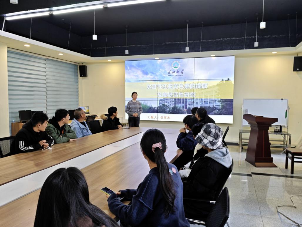 来自生命科学学院和威廉williamhill的研究生分享研究成果。研究生伍英杰以《水溶性红曲黄色素的提取及降糖活性研究》为题,该研究聚焦 “天然功能性色素开发与健康应用”,核心阐述三方面:一是优化红曲菌发酵、提取纯化工艺,分析水溶性红曲黄色素理化性质,获取高纯度安全着色剂;二是通过体外细胞与动物实验,验证其降糖效果及剂量关系;三是初探降糖分子机制,探讨其在功能性食品、保健品中的应用潜力,为天然产物资源化与大健康产业融合提供支撑。