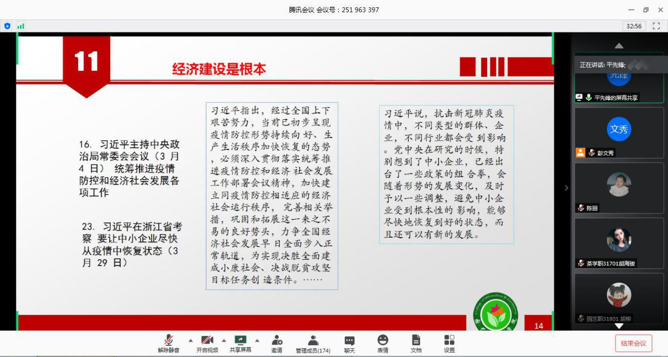 (通讯员:刘力源 彭文秀)为响应学校《关于组织全校本科生学习习近平总书记在新冠肺炎疫情防控期间重要讲话精神的通知》,进一步做好本科生思想政治教育工作,我院开展学习习近平总书记在新冠肺炎疫情防控期间重要讲话精神“云”学习活动。5月15日前,各班级召开主题班团会,做好习近平总书记关于新冠疫情防控讲话精神的专题“云”学习。5月16日上午9:30,院党委副书记平先锋在腾讯会议平台为我院全体学习小组成员进行一场“云”宣讲,参会人员计178人,同时在QQ群等平台展开“云”讨论。