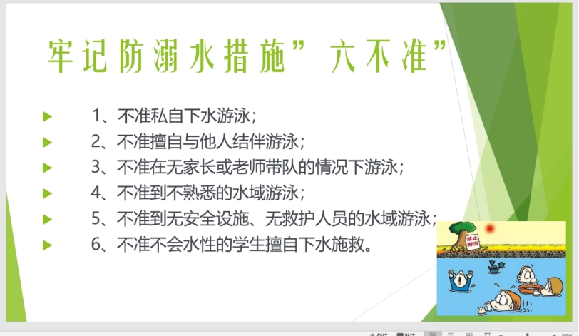 各班班会以实际发生的案例为切入点,以预防学生溺水为重点,利用观看视频等方式讲话学生安全教育。对学生进行预防溺水的知识普及教育:不私自下水游泳;不擅自与他人结伴游泳;不在无家长或教师带领的情况下游泳;不到无安全设施、无救援人员的水域游泳;不到不熟悉的水域游泳;不熟悉水性的同学不擅自下水施救。