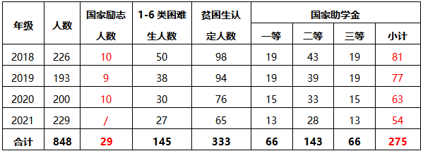 我院2021年国家励志奖学金资助总指标29人、2021年国家助学金资助总指标275人,各年级指标如下。