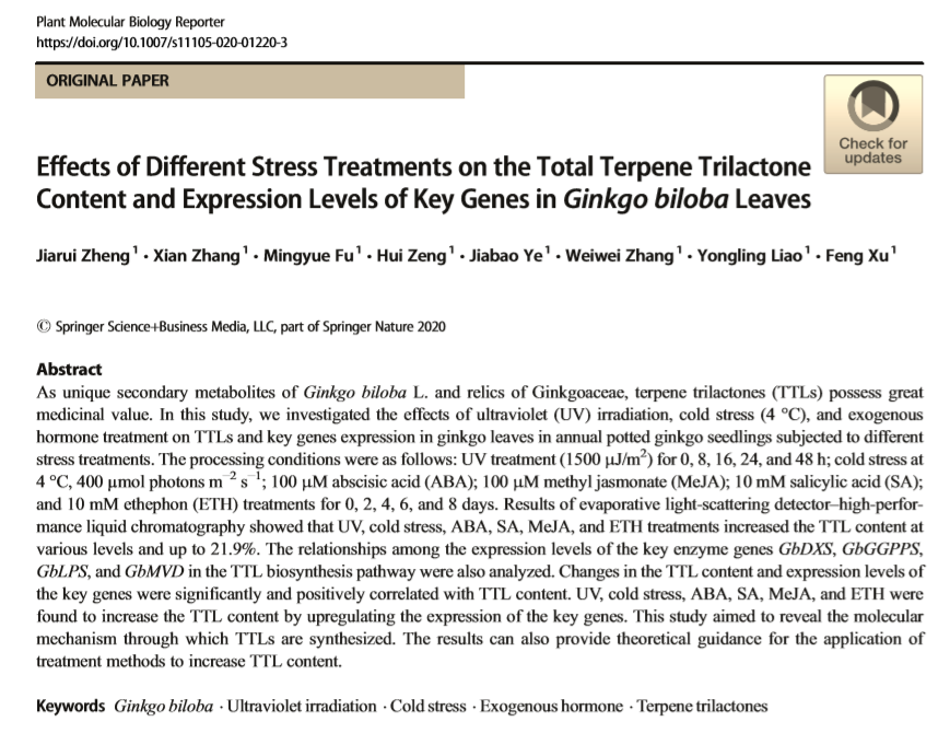 2020年5月,我院2018级硕士研究生郑嘉瑞以第一作者身份在Springer旗下期刊Plant Molecular Biology Reporter发表题为“Effects of Different Stress Treatments on the Total Terpene Trilactone Content and Expression Levels of Key Genes in Ginkgo biloba Leaves”()的论文(图1),通讯作者为廖咏玲博士和许锋教授,威廉williamhill为第一署名单位。