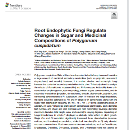 文章引用:Sun R T, Feng X C, Zhang Z Z, et al. Root Endophytic Fungi Regulate Changes in Sugar and Medicinal Compositions of Polygonum cuspidatum [J]. Frontiers in Plant Science, 2022, 13: 818909-818909. doi: 10.3389/fpls.2022.818909.