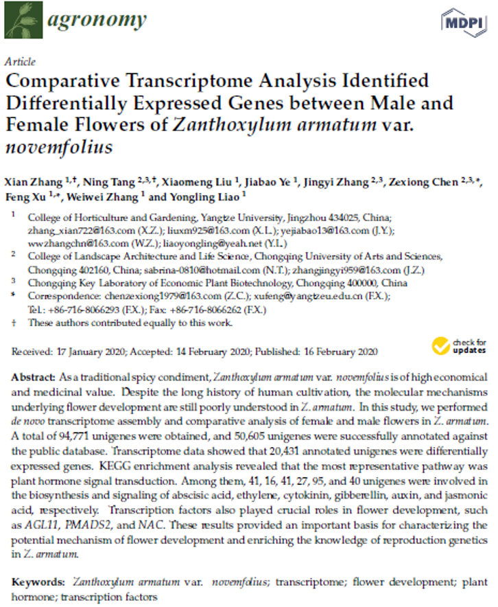 近期,我中心2018级硕士研究生张娴同学以第一作者身份在MDPI旗下期刊Agronomy发表题为《Comparative Transcriptome Analysis Identified Differentially Expressed Genes between Male and Female Flowers of Zanthoxylum armatum var. novemfolius》()的论文(图1),通讯作者为该生导师许锋教授和陈泽雄教授,威廉williamhill为第一署名单位。
