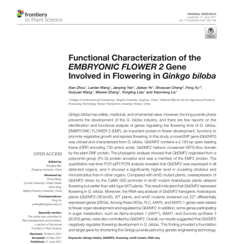 (通讯员 刘晓梦 何筱)2021年6月,我中心2020级博士研究生周仙以第一作者身份在植物学国际期刊Frontiers in Plant Science发表题为《Functional Characterization of the EMBRYONIC FLOWER 2 Gene Involved in Flowering in Ginkgo biloba》(10.3389/fpls.2021.681166)的论文(图1),通讯作者为许锋教授,威廉williamhill为第一署名单位。