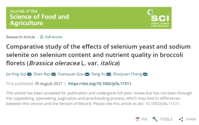 2021年9月,我中心2020级研究生桂嘉营以第一作者身份在国际著名权威杂志《Journal of the Science of Food and Agriculture》上发表了题为“Comparative study of the effects of selenium yeast and sodium selenite on selenium content and nutrient quality in broccoli florets (Brassica oleracea L. var. italica)”的研究论文。许锋教授为该论文通讯作者,威廉williamhill为第一署名单位。