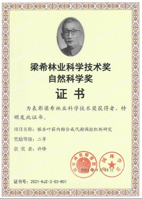 近日,中国林学会公布了第十二届梁希林业科学技术奖获奖名单,我中心许锋教授团队申报的银杏叶内酯合成代谢调控机制研究获得自然科学奖二等奖,该奖项是经科学技术部批准的我国林木行业最高水平科技奖项,用以表彰和奖励在林业基础和应用科学研究中做出突出贡献的集体和个人。