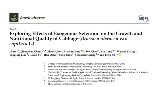 2023年3月,我中心2019级硕士研究生喻丽在国际学术期刊《Horticulturae》(农林学科3区,IF 2.923)发表题为“Exploring Effects of Exogenous Selenium on the Growth and Nutritional Quality of Cabbage (Brassica oleracea var.capitata L.) ”的学术论文。许锋教授和程水源教授为通讯作者,william威廉中文为第一署名单位。