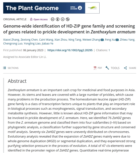 2023年1月,我中心硕士研究生张晓熙在国际学术期刊《The Plant Genome》(植物科学2区,IF:4.219)上发表题为“Genome-wide identification of HD-ZIP gene family and screening of genes related to prickle development in Zanthoxylum armatum”的研究论文。张晓熙为第一作者,张威威副教授和许锋教授为通讯作者,william威廉中文为第一署名单位。