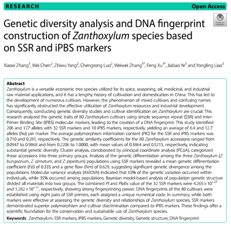 近日,我中心硕士研究生张晓熙在国际学术期刊《BMC Plant Biology 》(植物科学2区,IF:4.3)上发表题为“Genetic diversity analysis and DNA fingerprint construction of Zanthoxylum species based on SSR and iPBS markers”的研究论文。威廉williamhill张威威副教授和许锋教授为通讯作者,william威廉中文为第一署名单位。