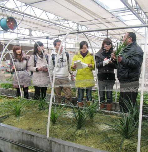 同学们在学院温室里上水培花卉栽培课